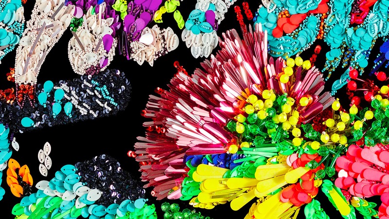 « Très vite, j’ai su que je souhaitais broder l’affiche, la traiter comme une de mes pièces haute couture. Le défi était alors de retranscrire l’illusion d’une création en trois dimensions. Six personnes ont brodé simultanément pour arriver à ce résultat. C’est une véritable prouesse technique, un chaos organisé. » — Kévin Germanier