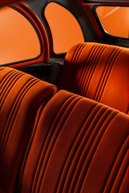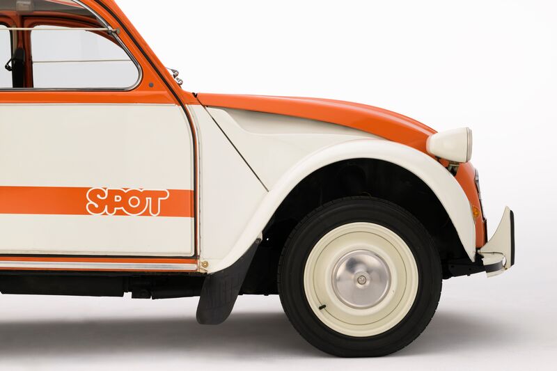 Ce qui frappe avant tout dans la 2 CV Spot, c'est la cohérence de son identité. Chaque détail est pensé pour former un ensemble harmonieux : la carrosserie bicolore Orange Ténéré et Blanc Meije, le tendelet rayé orange et blanc fixé au-dessus des places avant, les panneaux de portes au même motif bicolore, les enjoliveurs de roue en inox empruntés à la Dyane et la sellerie en tissu jersey Orange Vénitien avec sièges avant séparés. Sur chaque porte avant, un autocollant « Spot » vient signer l'ensemble en blanc sur un bandeau orange. La voiture est à la base une 2 CV 4 dont le moteur de 435 cm³ lui permet de dépasser les 100 km/h, pour une consommation sobre adaptée aux usages du quotidien d’alors de 5,4 litres. Elle est vendue 13 600 francs.